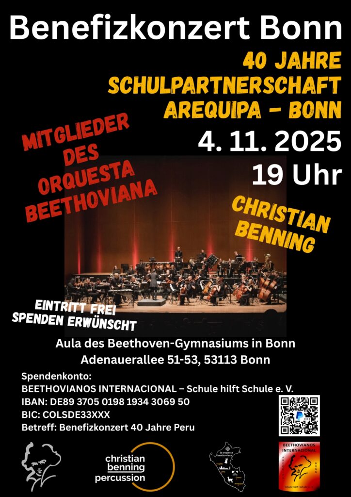 Anlässlich des 40-jährigen Jubiläums der Schulpartnerschaft und des peruanischen Nationalfeiertags am 28. Juli besuchen Frieda Schaaf und Dominic Ferber das Colegio Ludwig van Beethoven in Arequipa, Peru. Neben der Begrüßung durch die Bandas de Música der Primaria und Secundaria kann die medizinische Versorgung in der Polikliniken Espíritu Santo sowie weitere Projekte der Schulpartnerschaft vor Ort